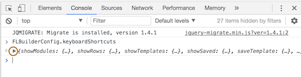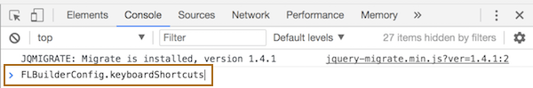 3. Type FLBuilderConfig.keyboardShortcuts into the console and press Enter. In Google Chrome, you'd type this command directly into the console, as shown in the following screenshot.