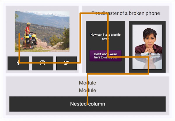 Columns in layouts can become quite complex, with multiple column groups in rows, child columns, and multiple modules in a single column group. For an overview of columns with many visual examples, see the column layouts overview.
