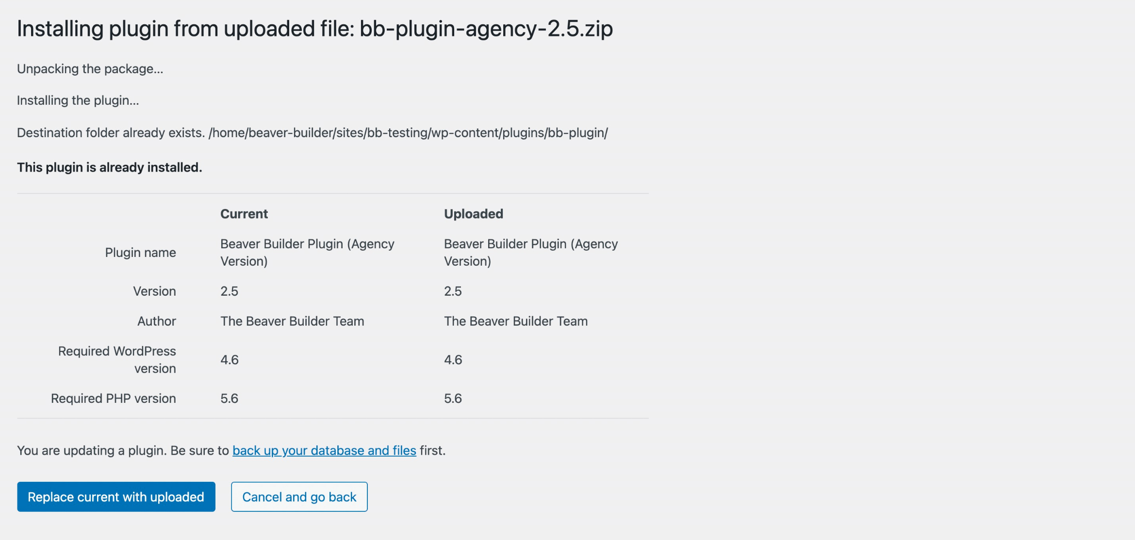 6. After the files have been uploaded, the screen will show information comparing the current and uploaded versions of the plugin or theme you're installing and asking whether you want to proceed.