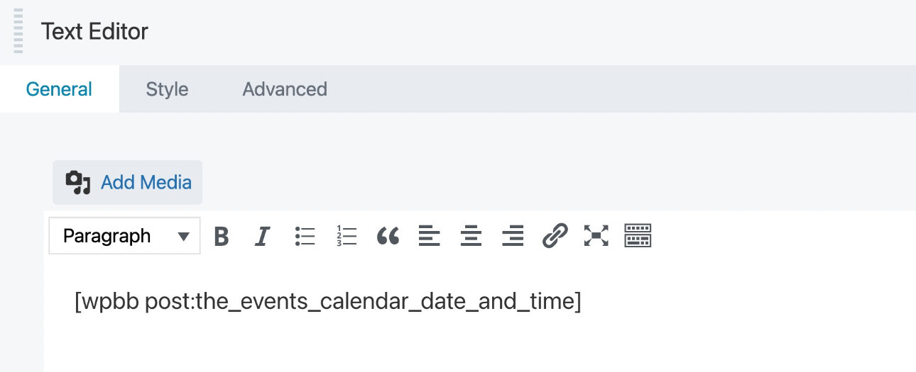 The Event Date & Time module is based on the Beaver Builder Text Editor module. It uses an instance of the classic WordPress editor and automatically inserts the the_events_calendar_date_and_time field connection into the text area, as shown in the image below.