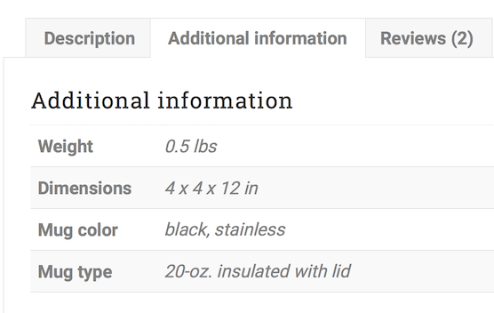 Additional information includes weight, dimensions, and product attributes, as in the following screenshot. If there is no additional information specified in the product, this tab isn't visible.