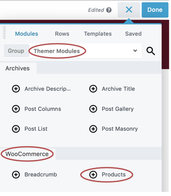 In Archive-type Themer layouts, the Products module is in the WooCommerce modules category on the Modules tab in the Content menu, assuming you have the WooCommerce plugin installed.