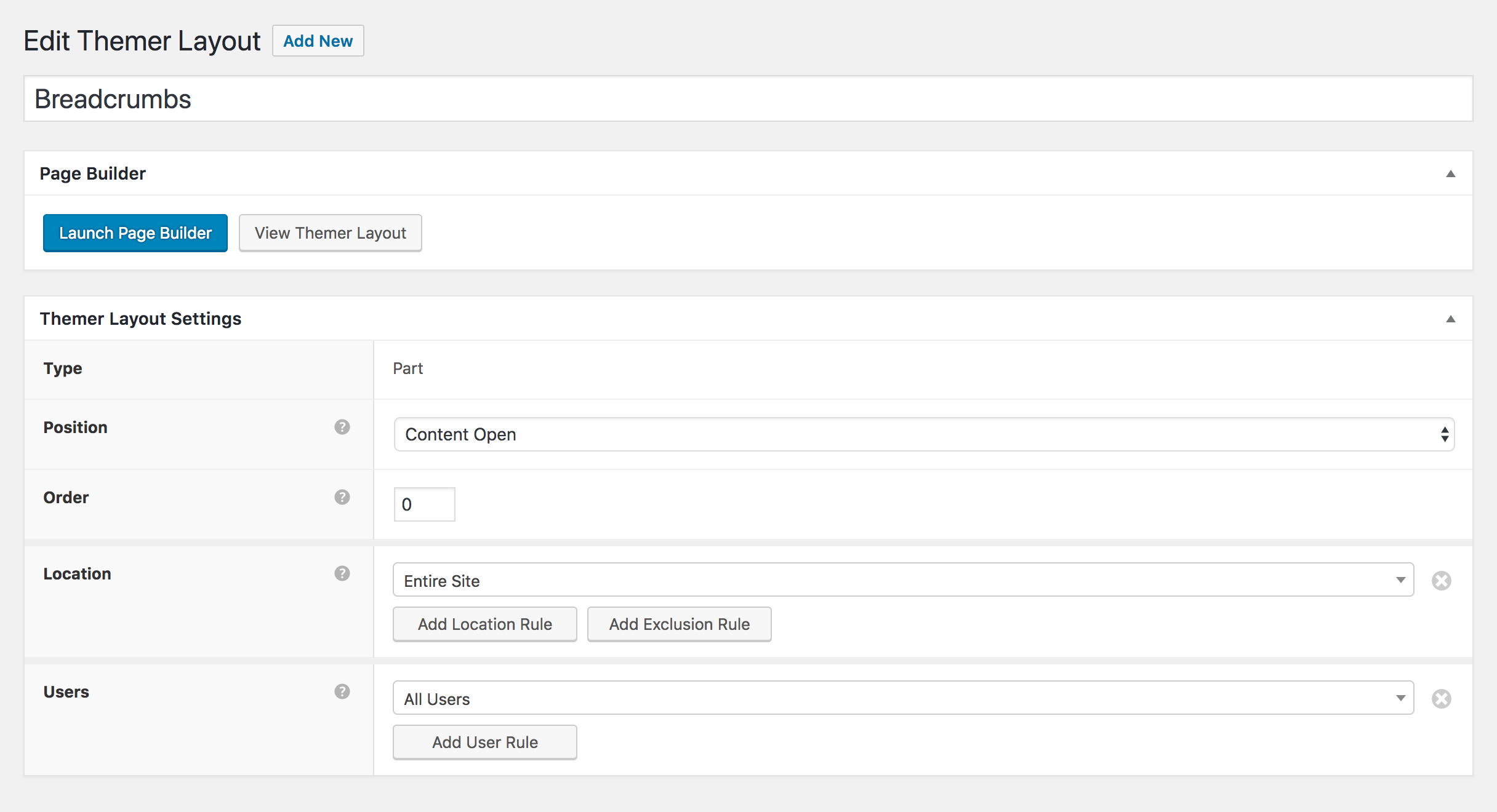 4. For Position choose where you want the breadcrumb to be located. In the following screenshot, the position has been set to Content Open, which means this part will appear at the top of the post or page content area.